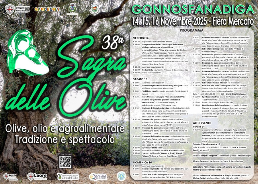 La 38^ sagra delle olive, dell'olio e dell'agroalimentare si svolgerà nelle giornate del 14, 15 e 16 novembre 2025 a Gonnosfanadiga.